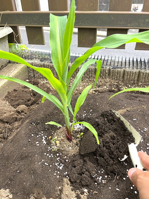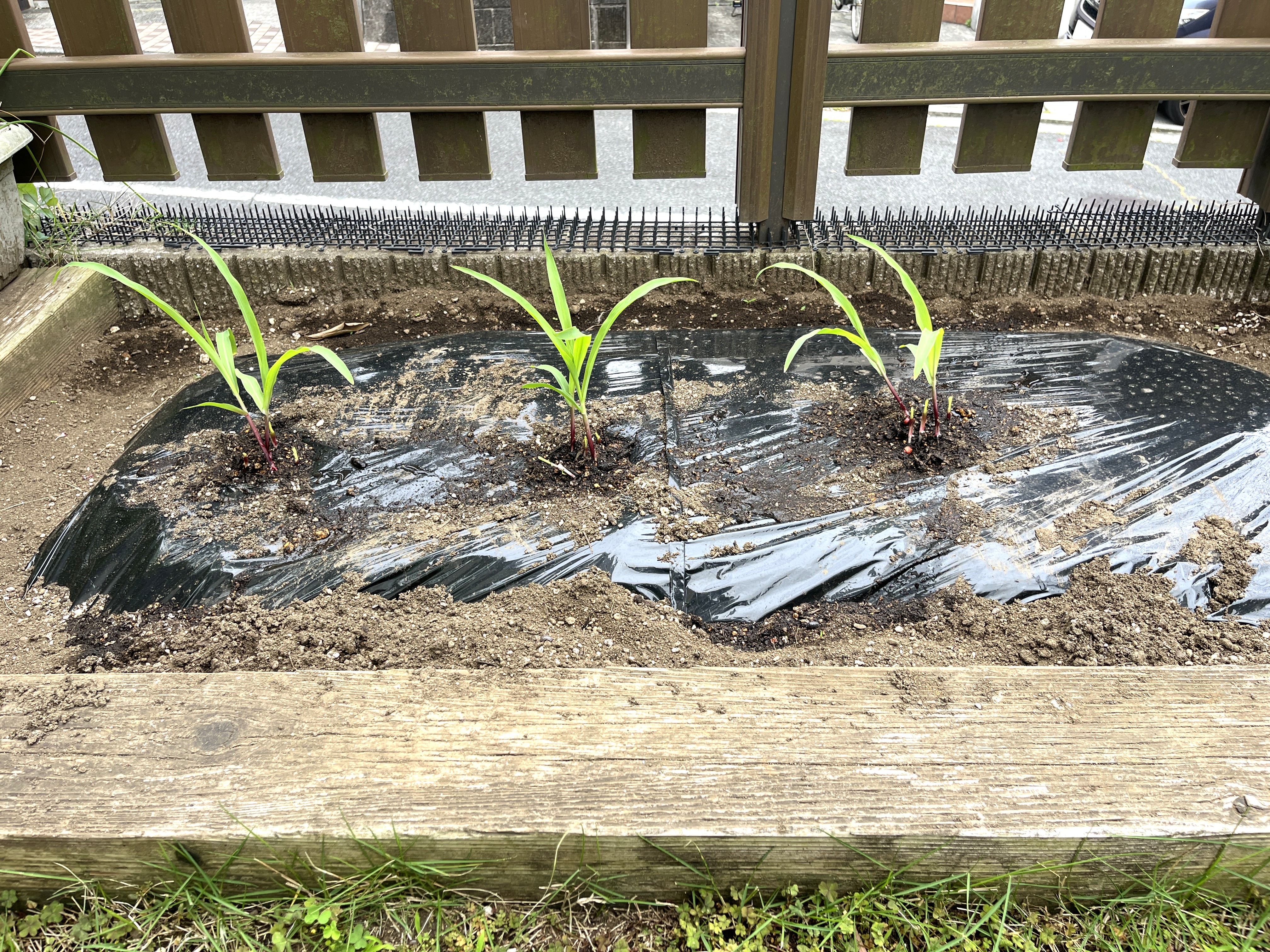 ポップコーンの種をポットに入れ生えてきたので、小さいですが畑コーナーにビニール袋マルチを設置して定植。