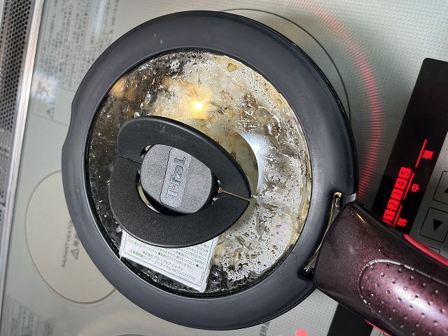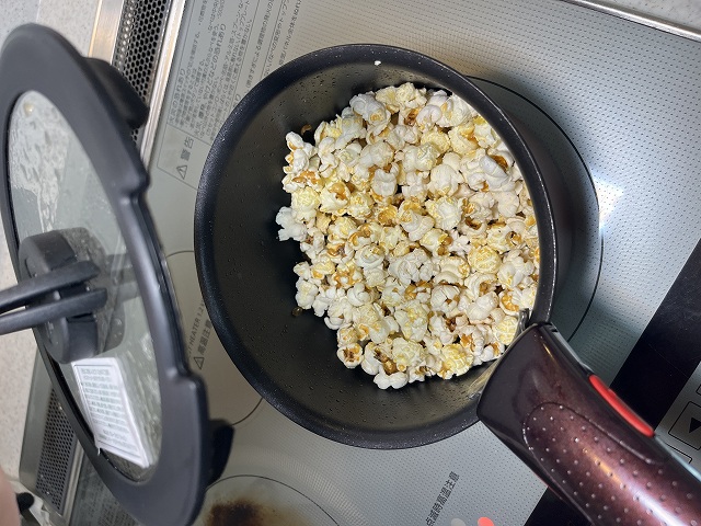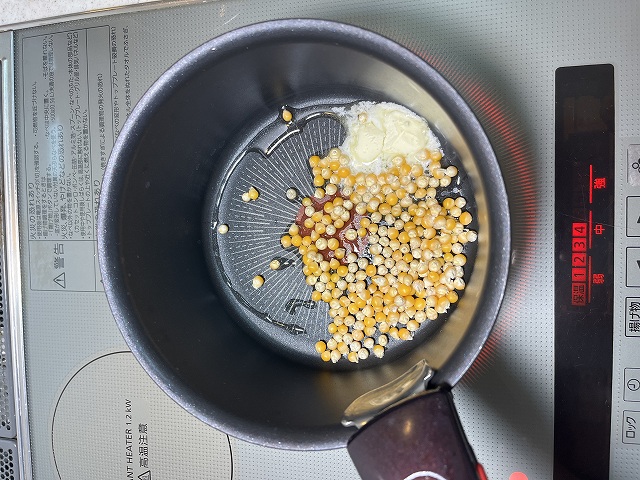 鍋に油を敷き、ポップコーンの種とバターを入れます。