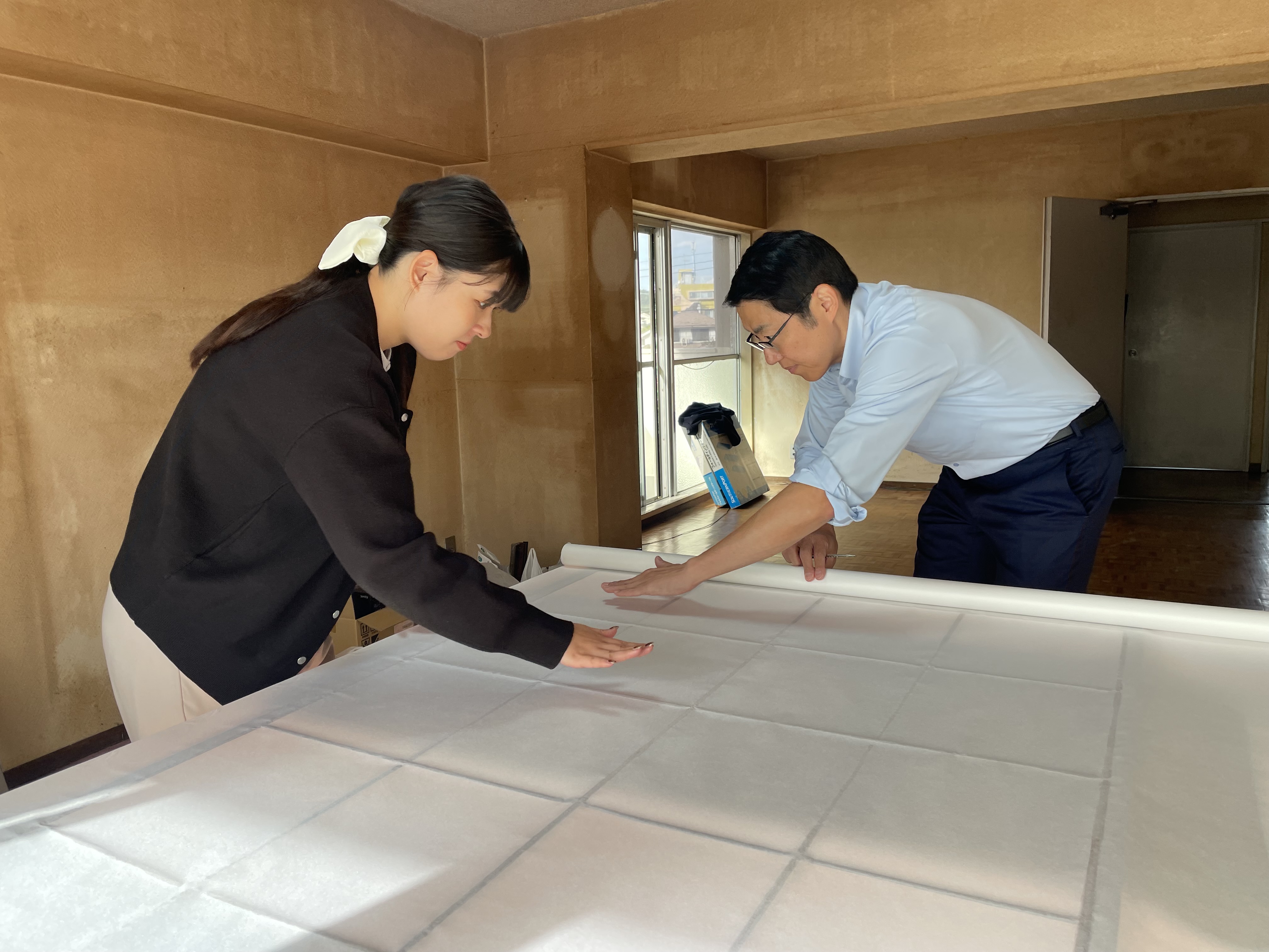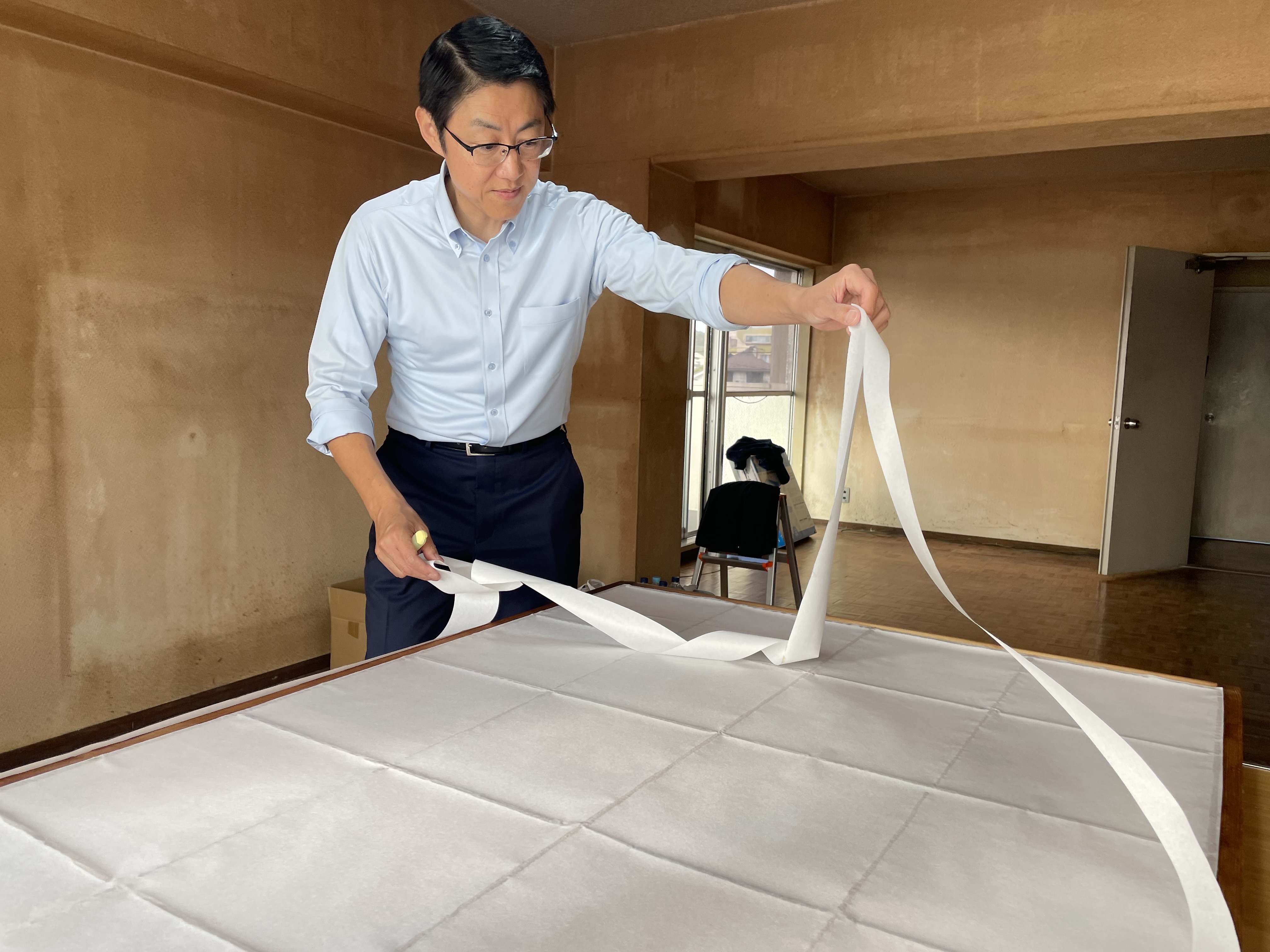 代表と志茂さんで優しく紙を抑えていきます。