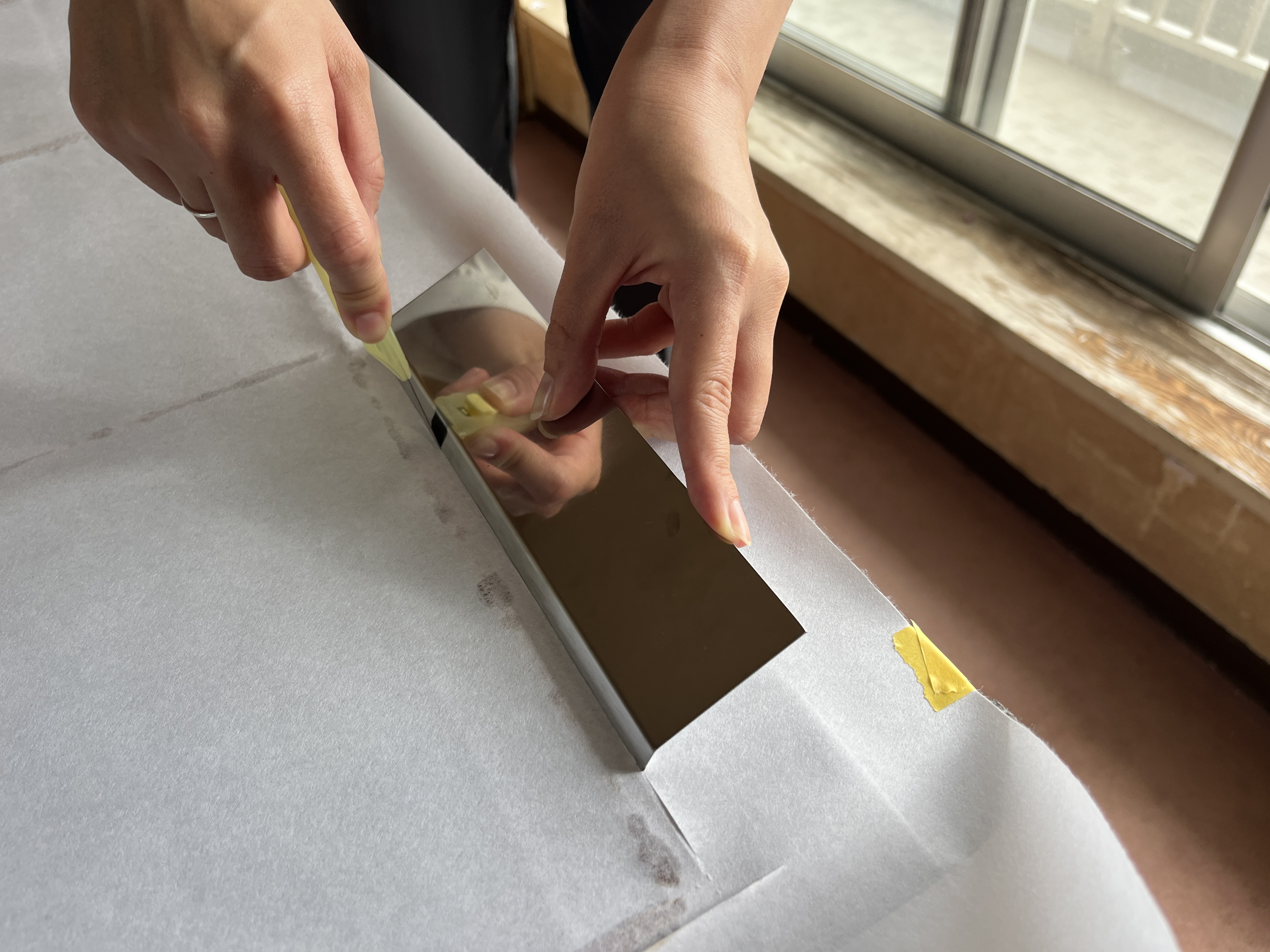 のりをつけたら、障子紙の張り始めの位置をマスキングテープで留めて、