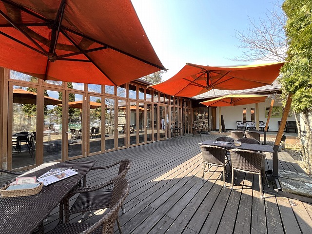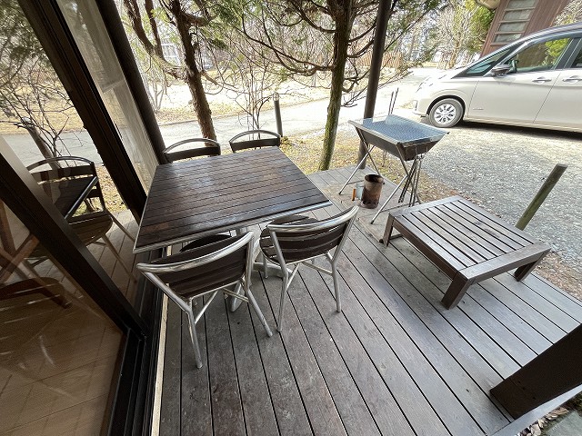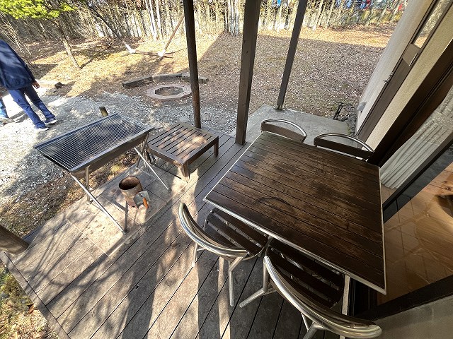 屋根付きテラスには、コンロ、テーブル、椅子がセット。
