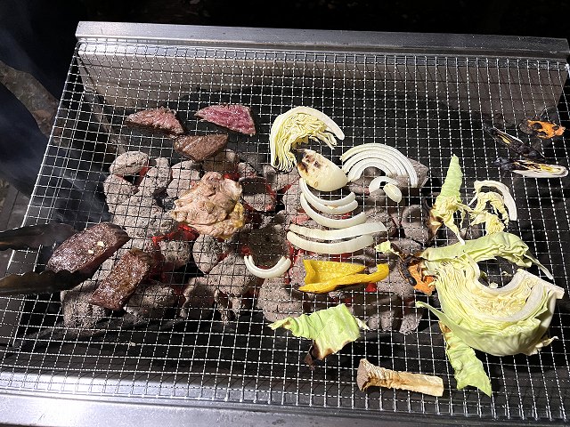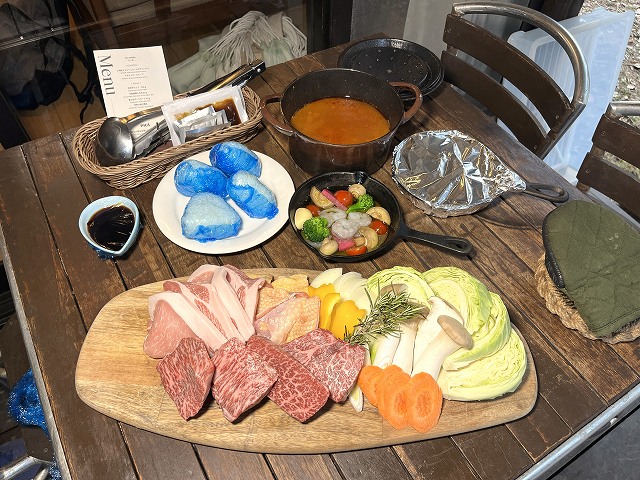 お肉、野菜、スープ、アヒージョ、おにぎりのBBQセットです。