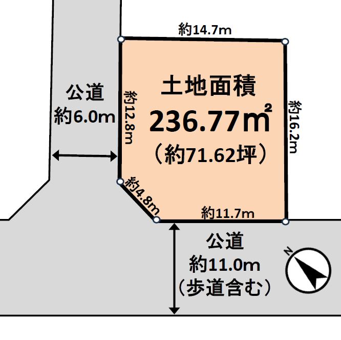 - 北西側公道約6.0mに約12.8m、南西側公道約11.0mに約16.5m接する