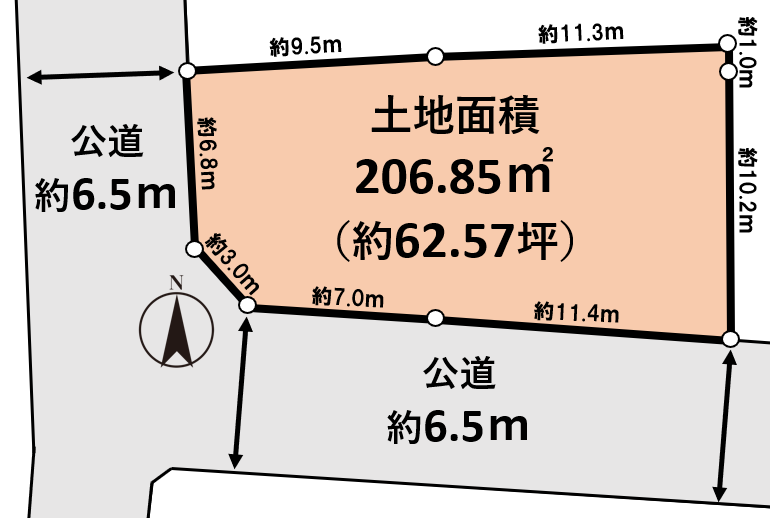 西側公道約6.5mに約6.8m接する- 現況/引渡