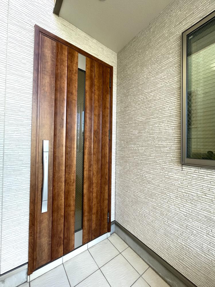 木目調でおしゃれな玄関ドアです。ダブルロックで防犯面も考慮されております。