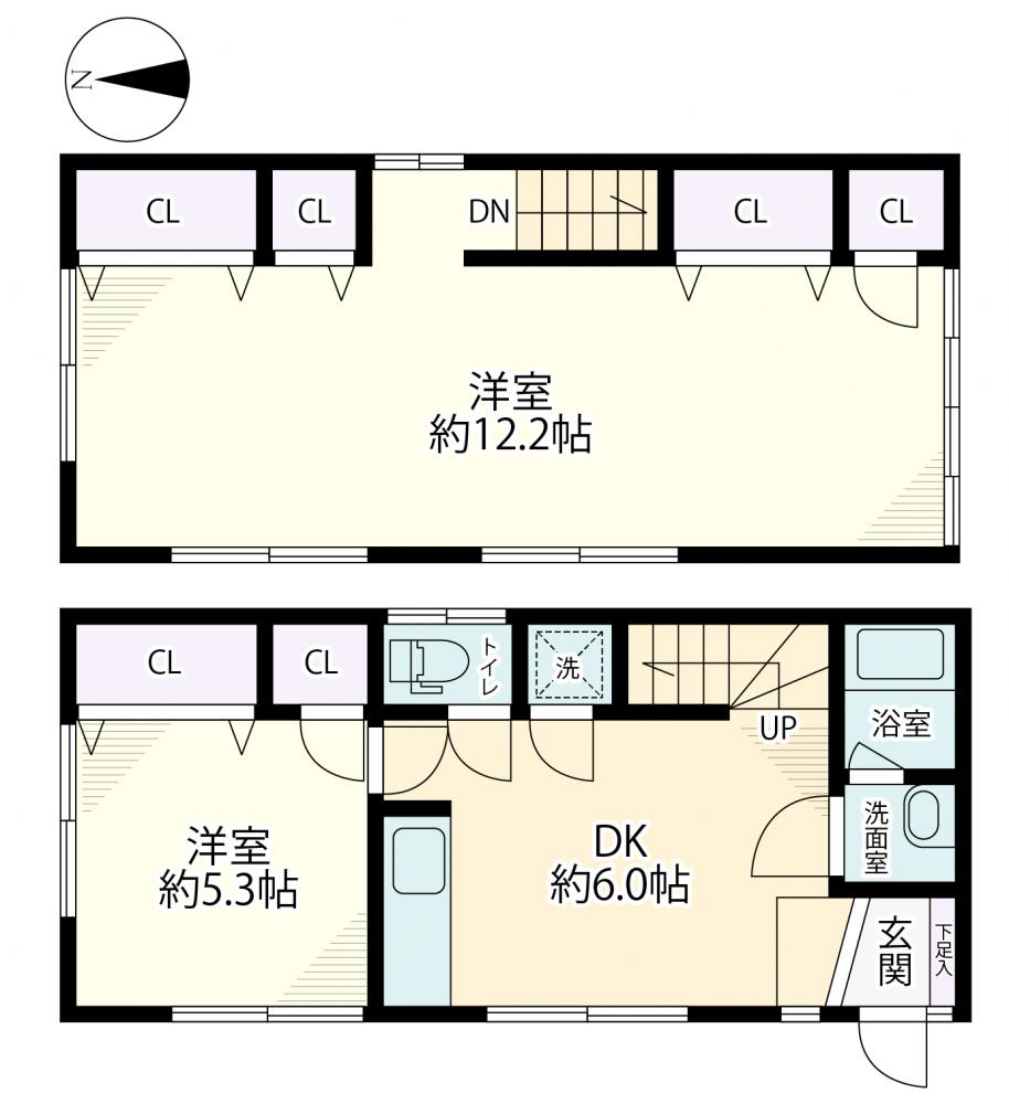 床面積約59.48m2、全室洋室仕様の木造2階建て2DK。現在賃貸中です。