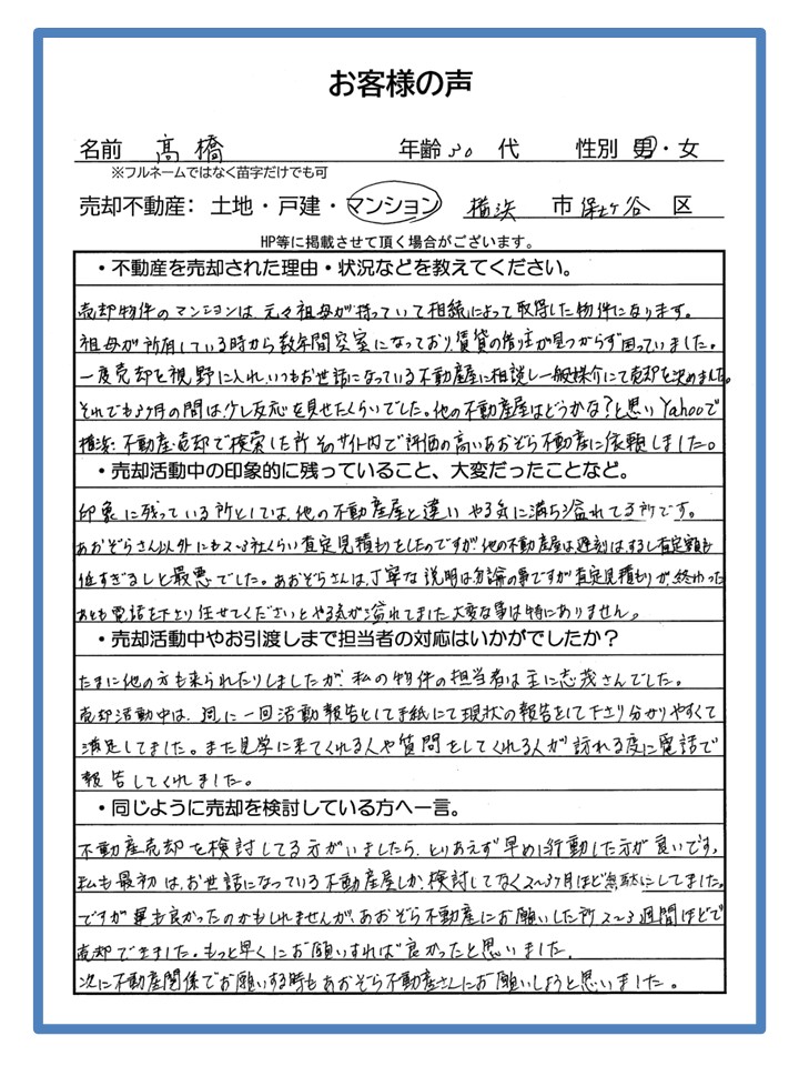 お願いした所2~3週間ほどで売却できました。 | 横浜市の不動産売却、査定・買取なら(株)あおぞら不動産