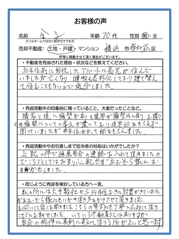 自分の物件を真剣に考えていただける所が良かった。 | 横浜市の不動産売却、査定・買取なら(株)あおぞら不動産