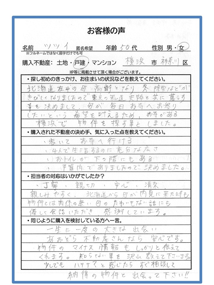 北海道在住の母が高齢となり、冬の除雪などがきびしくなりましたので、東京の私達夫婦と共に暮らす事を決めました。母が毎日お寺へお参りしたいという希望を叶えるため、お寺がある横浜で物件を探す事としました。